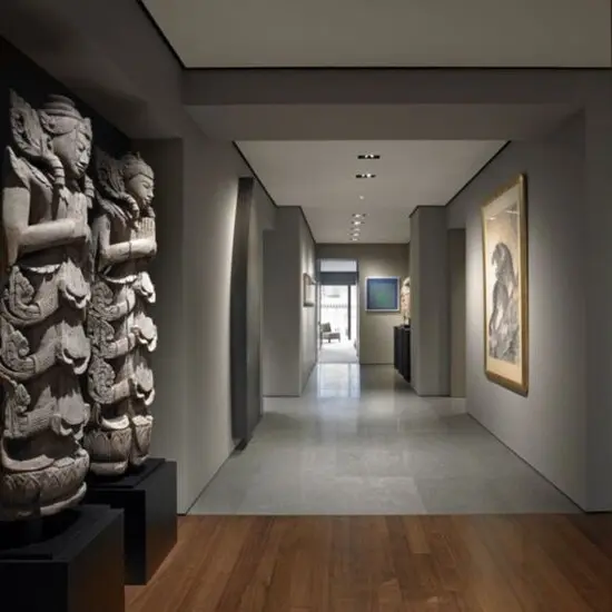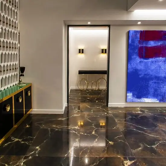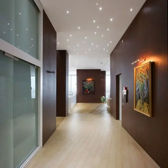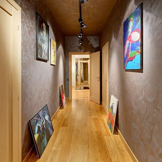 Можно комбинировать: паркет положить в холле, а во входной зоне - плитку. Эффективная текстура плитки считается имитирующая камень или дерево. Это может быть также белая плитка с фрагментарными чёрными вставками. Удивительно выглядит вариант, сочетающий кремовый и бежевый оттенки. В центре холла шикарно будет выглядеть мозаичное панно, для которого можно подобрать художественный паркет и керамогранит.
